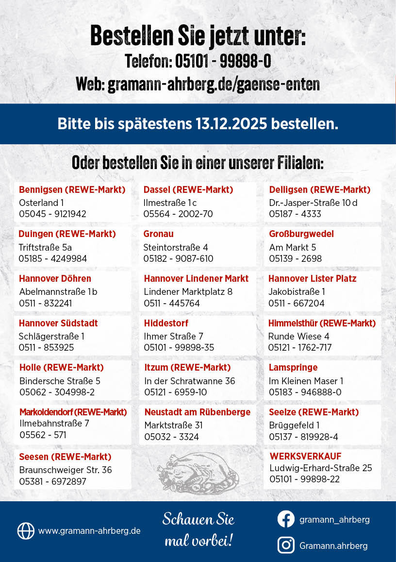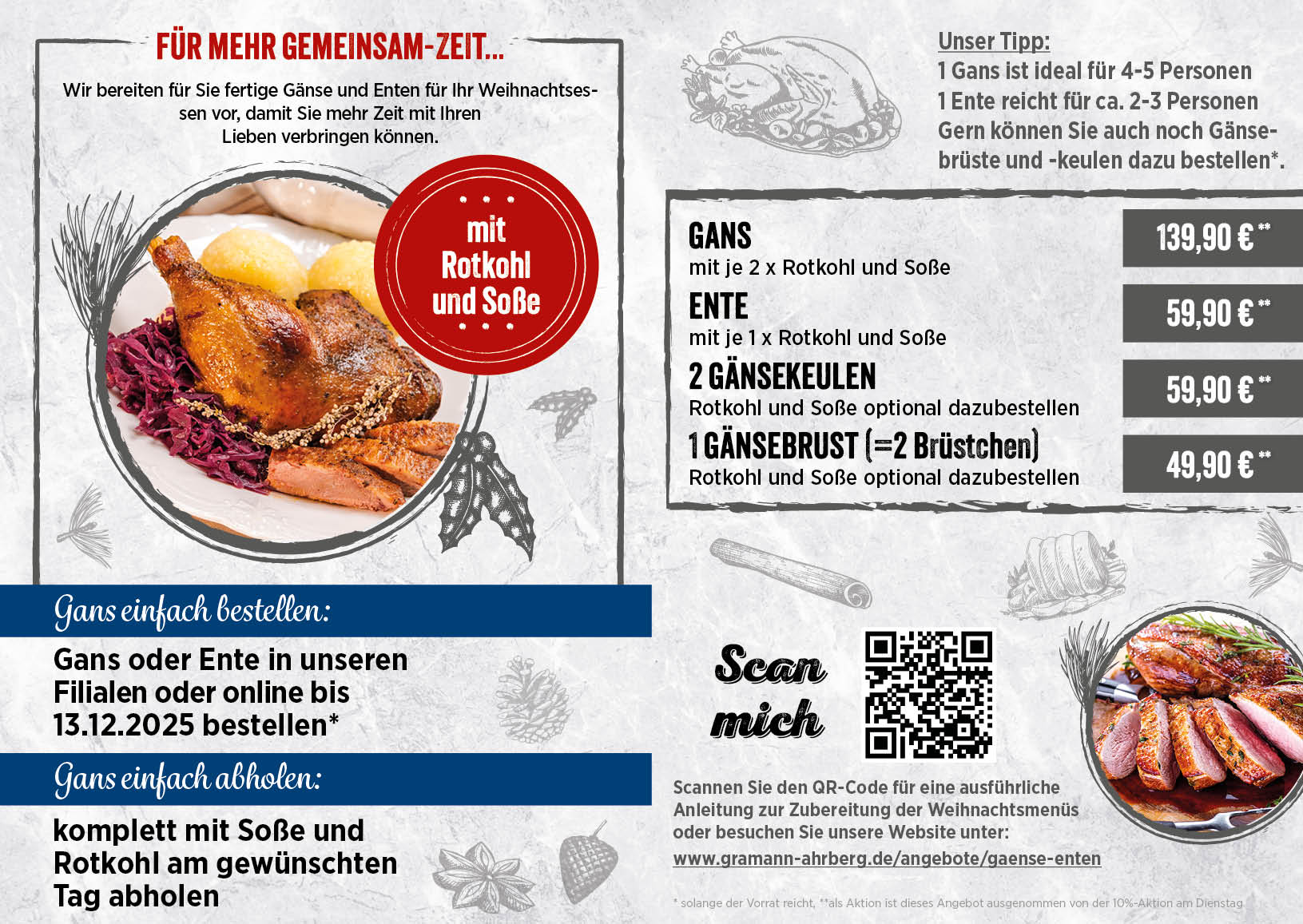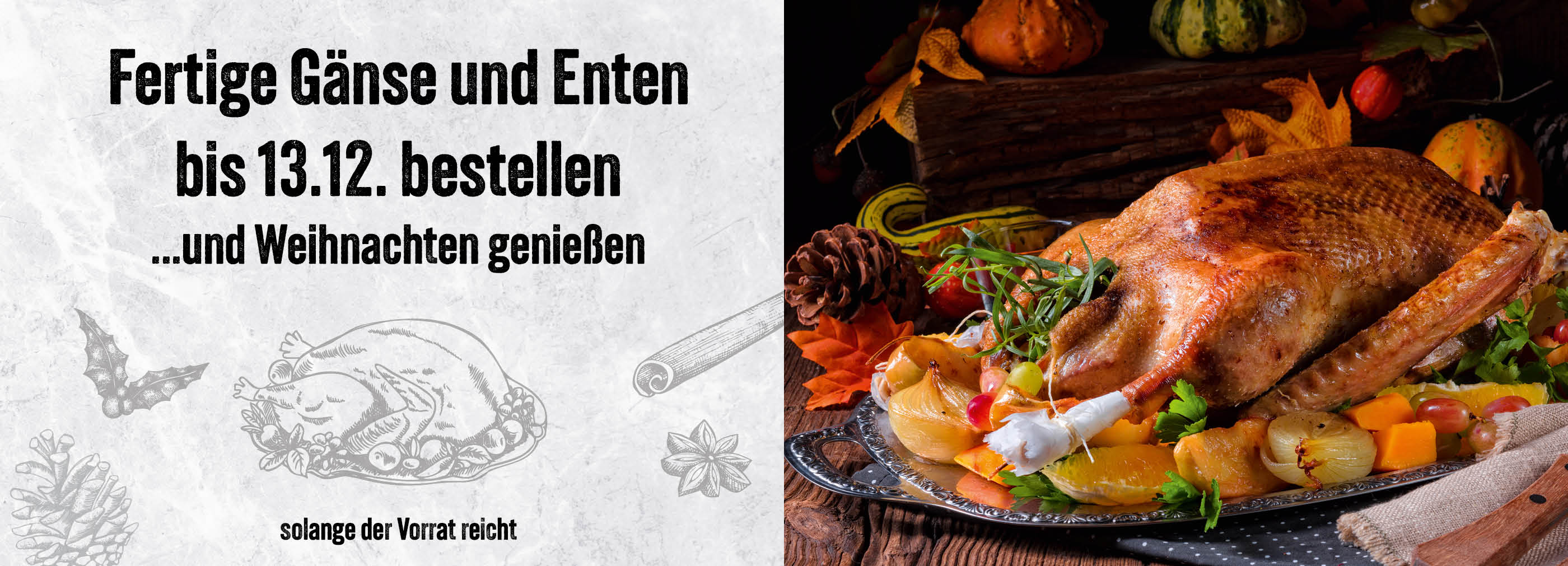 Bestellen Sie in der Zeit bis zum 13. Dezember 2025 Ihre Gans oder Ente bei uns - entweder gleich hier online oder in den Filialen.