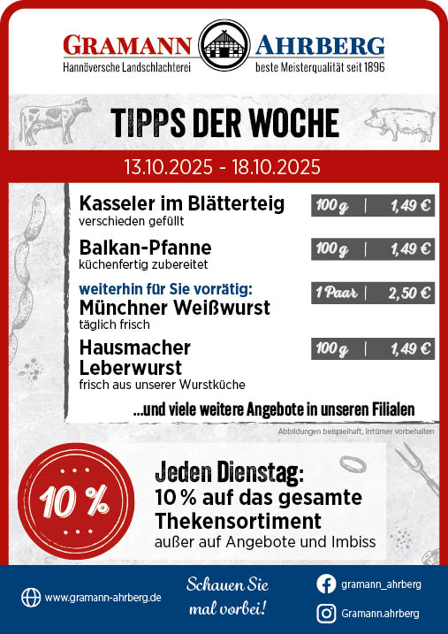 Wir bieten Ihnen sorgfältig ausgewählte Angebote der Woche zum Vorteilspreis. Neben saisonalen Spezialitäten bieten wir frische Produkte aus der Wurstküche genauso an wie bestes Fleisch aus der Region.